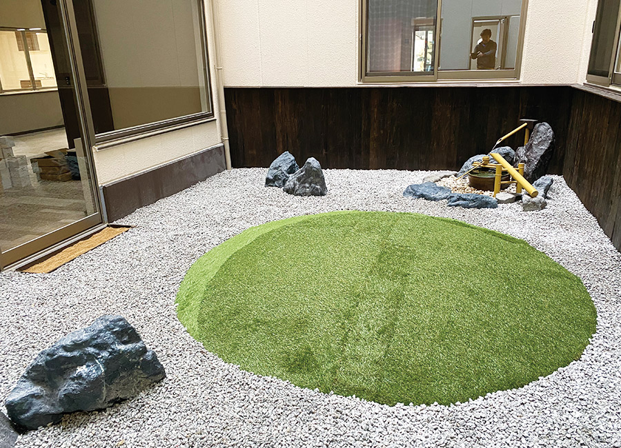 ご依頼をいただき、大阪市の介護施設にて中庭庭園の施工を行いました。 壁に杉板焼き仕上げを打ち付け、人工石で蹲(つくばい)を作り、景石の人工石、真ん中の人工芝で会社のロゴを作成。 上記施工を行い美しく癒しの中庭庭園が完成致しました。