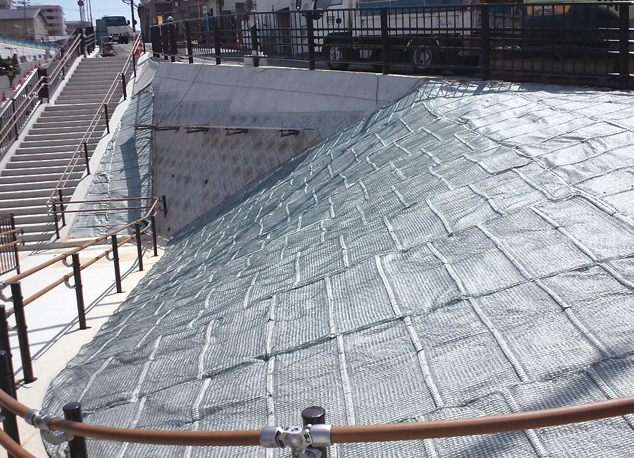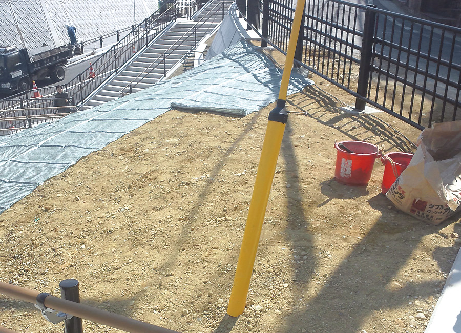 きつい法面により雨などで土が流れてしまう為、 芝育成シートを張り土に芝の種を根付かせ、流れにくくなる様に保護致しました。