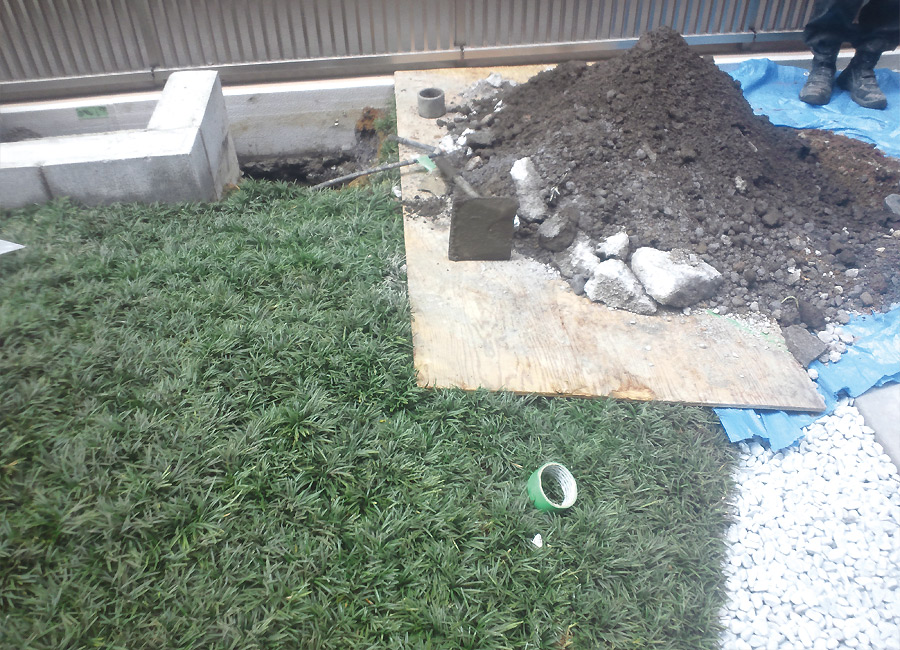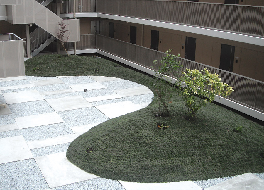 マンションの中庭の大型植栽を施工致しました。 タマリュウを前面に植栽、アンジュレーションを使った山にし、落ち着きのある美しい中庭に仕上がりました。